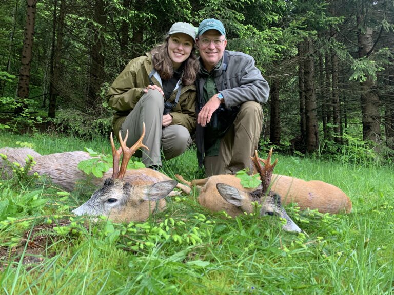 During our first day’s hunt, we were in the field early. Daybreak found us sneaking through the remote fields, glassing the edges in the heavy dew and fog. A lovely roe buck sauntered along the hedgerow and we stalked around it. Madeline went with the outfitter, Mike, and they snuck low behind cover while I watched them ease out of sight. Apparently, the deer closed the distance and picked its way across an opening slowly and then paused. Sticks up, a firm rest, and the crack of the rifle. A clean kill, well executed by my daughter, who was jubilant. I had flashbacks of my pre-teen deer-hunting buddy, as well as her younger sister, when each of them took their first deer on our Kentucky farm. She was as joyful about this success as she had been many years ago.
