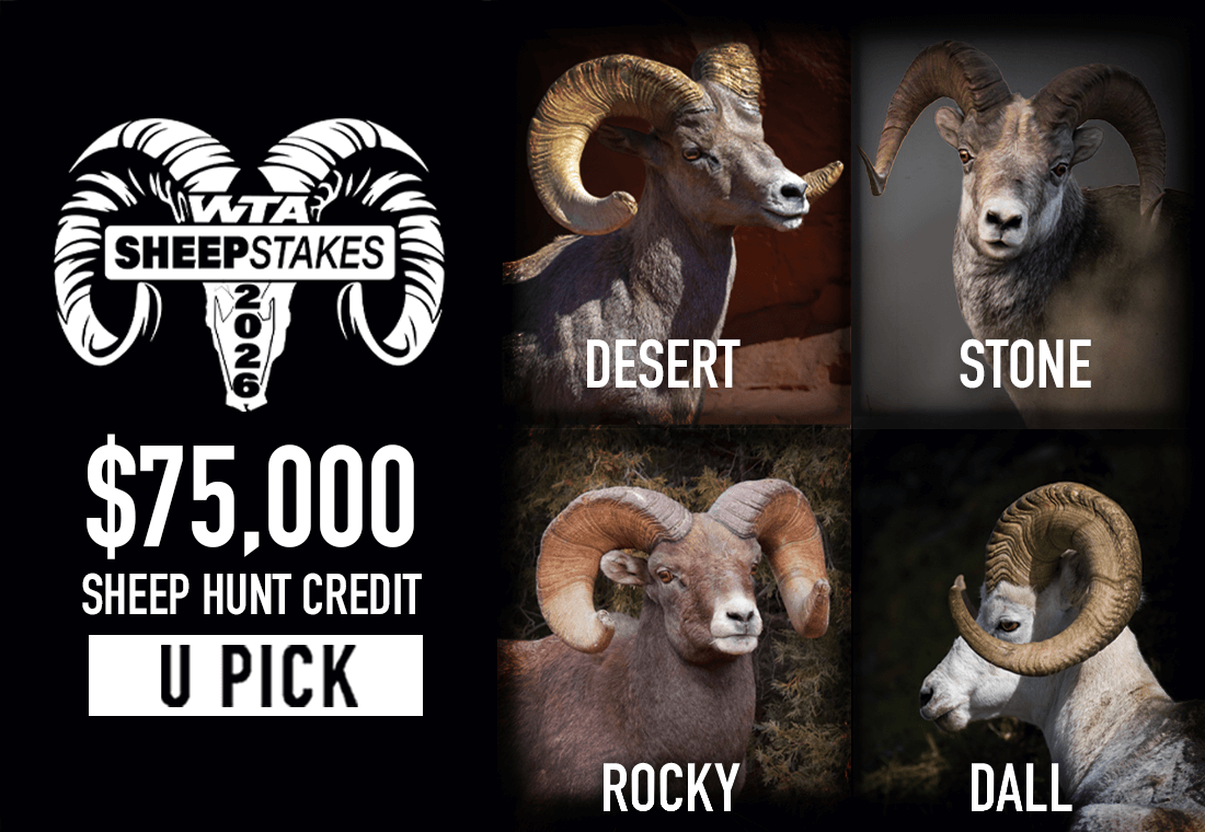 Get ready to hand-pick your hunt of a lifetime! With a $75,000 sheep hunt credit, you can book any sheep hunting adventure to help you complete your Grand Slam® from our extensive selection of trips available on the WTA website. Whether you’re dreaming of a trophy Rocky Mountain sheep hunt in the Rockies, a Dall sheep adventure in Alaska, chasing a Stone sheep in Canada, or stalking a Desert Bighorn in Mexico, the possibilities are endless.